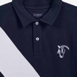 Polo clásico con banda frontal blanco y verde confeccionado en tejido 100% algodón. Corte recto, cuello clásico, cierre mediante tapeta a contraste de dos botones, manga corta terminada en puño al contraste. Bajo con aberturas laterales. Bordado en el pecho de nuestro caballo y aplique de número conmemorativo en la manga derecha. -